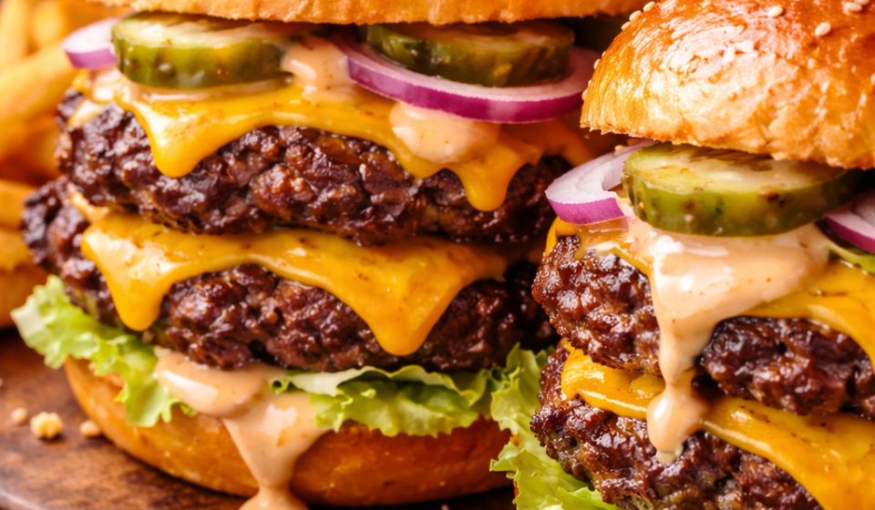 - Stack 2 patties per burger, add pickles/onion/lettuce, close, and serve.